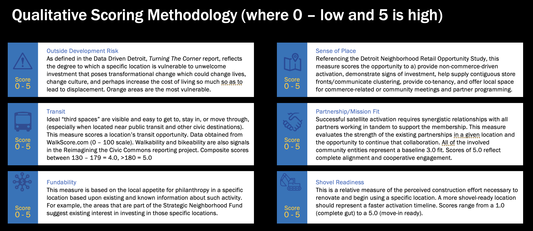 I developed a composite scoring methodology that evaluated each potential location across six dimensions: fundability, sense of place, partner/mission fit, shovel readiness, transit access, and outside development risk. This gave the coalition an evidence-based way to compare neighborhoods and prioritize phased expansion.